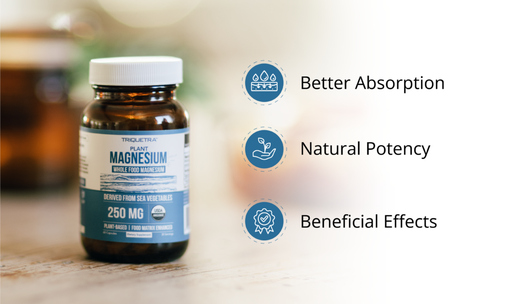 Plant Magnesium™ supplements, made from whole foods and sea vegetables, are easily absorbed by the body. They support restful sleep, heart health, muscle function, and can reduce stress and anxiety. Regular intake could also prevent metabolic problems. Speak with a healthcare provider if you intend to take supplements to improve your overall health.